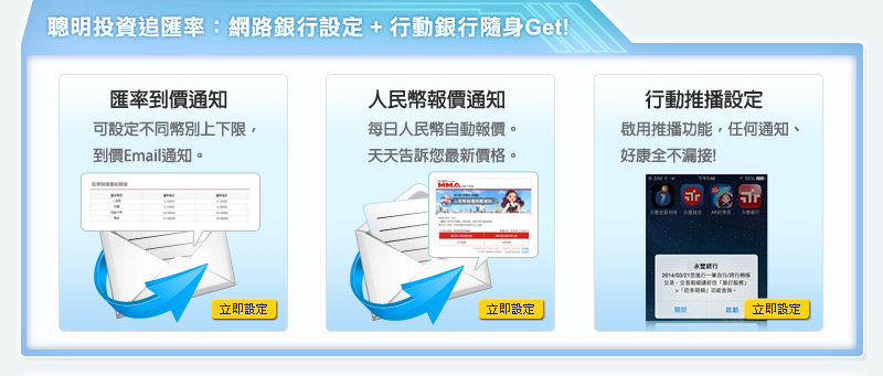 匯率到價通知 人民幣報價通知 行動推播設定 行動理財術 行動@好康 行動生活便利資訊 行動粉絲團 行動購物付款 行動銀行主頁 mma金融交易網